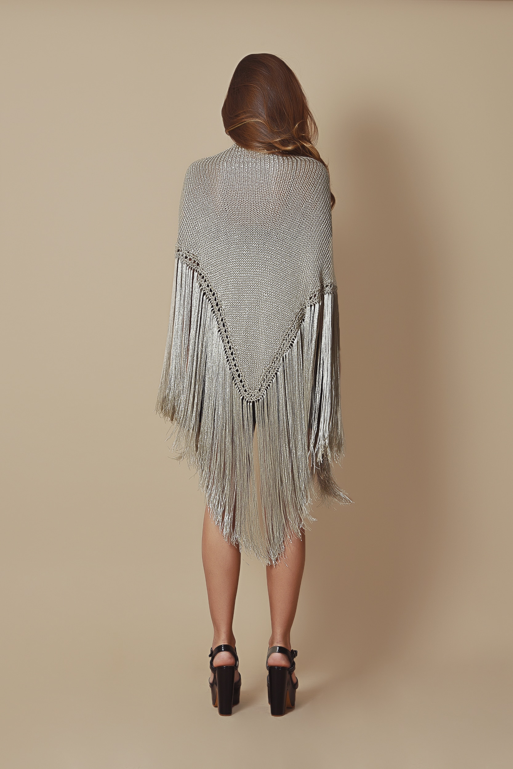 Add a hint of 70s inspired boho luxe to your wardrobe with heavy fringing and intricate knitted silk. Handknitted natural silk shawl with hand-placed fringing and traditional crochet design.